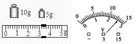 若天平平衡时右盘砝码的质量、游码在标尺上的位置如图所示,则石块的质量 g。图中的电压表,若选0~3Ⅴ的量程,读数为 Ⅴ。