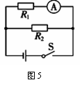 在图5电路中,R1=20Ω,R2=30Ω,闭合开关后,电流表的示数为0.6A.电阻R1两端的电压是 V,通过R2的电流是 A,电路中的总电阻R总是 Ω.
