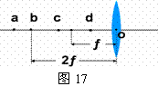 ⑶点燃的蜡烛分别放在a、b、c、d、四个不同的位置,如图17所示, 其中蜡烛放在__________处所得到的实像最小;放在__________处得到正立的虚像;在__________处的成像规律是放大镜的原理;