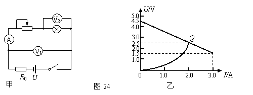 如图24甲所示,电源电压为U保持不变,R0为定值电阻。闭合开关,电流表A的示数为I,电压表V1的示数为U1,电压表V2的示数为U2。移动滑动变阻器得到在不同电流下的U1—I图线和U2—I图线,如图24乙所示。
