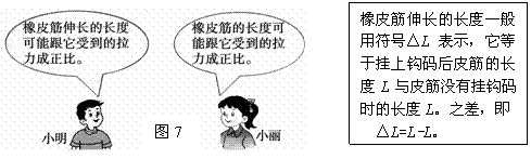 在“制作橡皮筋测力计” 的活动中,同学们发现:在一定的范围内,橡皮筋受到的拉力越大,橡皮筋的长度越长。根据这一现象,小明和小丽提出如下猜想(见图7)。究竟谁的猜想正确呢?他们决定一起通过实验来验证自己的猜想。