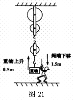 如图21所示(滑轮组的绕绳未画出),人以600N的力向下拉动绕在滑轮组的绳子一端10s,使绳端向下移动了1.5m、重物匀速上升了0.5m,已知滑轮组的机械效率为70%(g=10N/kg).