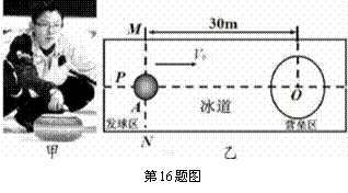 冰壶运动是冬奥会的比赛项目,如图甲所示.冰道的左端有一个发球区,运动员在发球区边沿的投掷线MN将冰壶以一定的初速度推出,使冰壶沿着冰道的中心线PO滑行,冰道的右边有一个圆形的营垒,如图乙所示,以场地上冰壶最终静止时距离营垒圆心O的远近决定胜负,投掷线MN与营垒圆心O的距离是30m.