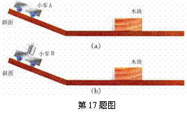 实验一:让不同小车分别从同一斜面的同一高度由静止开始下滑,撞击水平面上的同一木块,看哪次木块被推得远(如图所示).
