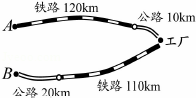 如图,某化工厂与A,B两地有公路和铁路相连,这家工厂从A地购买一批每吨1 000元的原料运回工厂,制成每吨8 000元的产品运到B地.已知公路运价为1.5元/(吨•千米),铁路运价为1.2元/(吨•千米),这两次运输共支出公路运费15 000元,铁路运费97 200元。