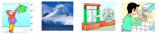 A.冰冻的衣服晾干 B.春天冰雪消融 C冬天窗玻璃上有水滴D.用干手器将手烘干