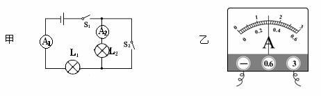 在如图甲所示的电路中。S1、S2同时合上后,电流表A1的示数如乙图表盘所示,则通过电灯L1的电流为 A,通过电灯L2的电流为 A;若合上S1,断开S2,则L1、L2是 (选填“串联”或“并联”)关系。