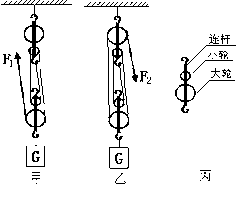 在图7中,甲、乙两个滑轮组都是由相同的滑轮组合而成。如图丙:大轮重10N,小轮重5N,连杆重1N。先后用甲、乙两种方式提起![]()