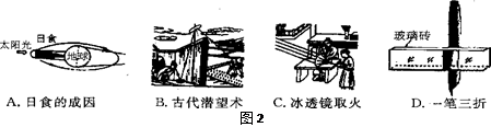 | A.湖水中树木的倒影 | B.插入水杯中变弯的筷子 |