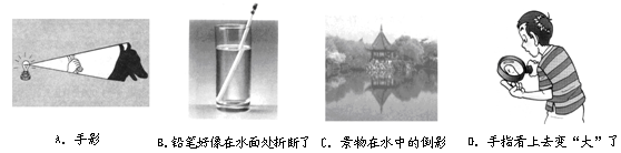 | A.小孔成像 | B.凸透镜成像 | C.光的折射 | D.光的反射 |