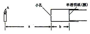 如图,点燃的蜡烛放在距小孔a处,它成像在距小孔b的半透明纸上,且a大于b。则半透明纸上的像是( )![]()