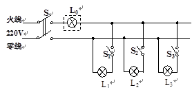 电工师傅常用一只标有“220V 40W”的灯泡L0(检验灯泡)取代保险丝来检查新安的照明电路中每个支路的情况,如图所示。当只闭合S、S1时,L0不亮;当只闭合S、S2时,L0和L2都呈暗红色;当只闭合S、S3时,L0正常发光。由此可以判断 ( )![]()