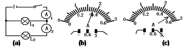 如图所示(a),当开关S闭合时,两只电流表的示数分别由图(b)、(c)读得,则电灯L1中的电流是:( )![]()