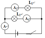 如图所示的电路中,闭合开关后,A1、A2、A3三个电流表的示数分别为I1、I2、I3,已知I3=0.5A,I1=0.3A,则通过电灯L2的电流为 ( )![]()