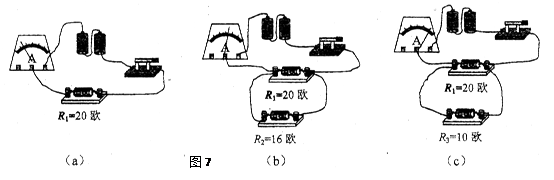 小明同学在“探究并联电路电阻的规律”实验中,他利用2节干电池作为电源,将电阻R2或R3分别与电阻R1并联,研究过程如图7(a)、(b)、(c)所示。请仔细观察图中的操作和现象,然后归纳得出初步结论。(1)比较图7(a)、(b)或图7(a)、(c)可知:___________________________________。 (2)比较图7(b)、(c)可知:________________________________________________。