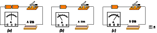 在“探究导体中电流与电压的关系”的实验中,小李同学利用若干节新干电池作为电源,在电路中接入不同的导体A、B进行实验,其研究过程如图8所示。请你仔细观察和比较图中的实验装置、实验操作和电流表的偏转情况,然后归纳得出初步结论:⑴比较图8中的(a)和(b)两图可得出的初步结论是: (1) 。⑵比较图8中的(b)和(c)两图可得出的初步结论是: (2) 。