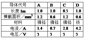 小明同学想探究影响导体电阻大小的有关因素,他想到道路越细长就越难走,所以猜想电阻的大小与导体的长度和横截面积有关.于是小明设计了如图所示的电路,并利用右表给出的导体A、B、C进行实验探究:![]()
