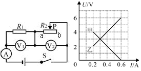 如图所示电路,电源电压保持不变,当闭合开关S,将滑动变阻器的滑片从b端移到a端,两个电阻的“U-I”关系图像如图所示。下列判断正确的是![]()