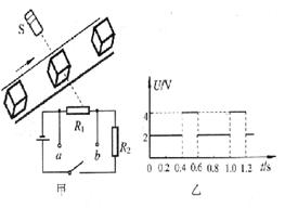 如图甲是某生产流水线上的产品输送及计数装置示意图。其中S为激光源,Rl为光敏电阻(有光照射时,阻值较小;无光照射时,阻值较大),R2为定值保护电阻,a、b间接“示波器”(示波器的接入对电路无影响)。水平传送带匀速前进,每当传送带上的产品通过S与Rl之间时,射向光敏电阻的光线会被产品挡住。若传送带上的产品为均匀正方体,示波器显示的电压随时间变化的关系如图乙所示。己知计数器电路中电源两极间的电压恒为6V,保护电阻的阻值为400Ω。则![]()