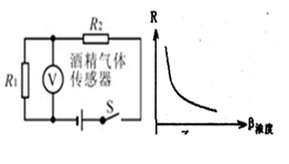 从2011年5月1日起,驾驶员酒醉后驾车要负刑事责任。酒精测试仪可检测驾驶员是否酒后驾车,如图所示是它的原理图。图中R1为定值电阻,酒精气体传感器R2的电阻值随酒精气体浓度的关系如图像所示,如果驾驶员呼出的酒精气体浓度越大,那么测试仪的 ( )![]()