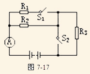 (4分)如图7-17所示电路中,电源电压为12V,R2=20Ω。当S1,S2合上时,电流表示数为0.8A,当S1,S2断开时,电流表示数为0.2A。求R1和R3的值。