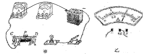 (3)实验中,当滑动变阻器滑片在某一位置时,电流表的示数如图乙所示。请读出它的示数,并将其数据填入表中(表中已有另外两次实验的数据)。![]()