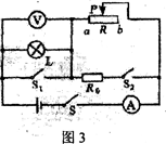 在图3所示的电路中,闭合开关S,让开关S1和S2断开,调节滑动变阻器的滑片P使其位于变阻器的最左端a处,此时灯泡L恰好正常发光,电流表A和电压表V均有示数。已知变阻器的最大电阻大于灯泡L的电阻,以下判断正确的是( )![]()