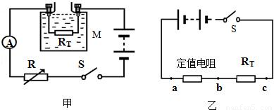 热敏电阻的阻值会随温度的改变而改变.小明同学用甲图所示的电路来探究热敏电阻RT的阻值与温度的关系.已知M为控温器,电源电压恒为12伏,R为电阻箱(一种可以改变并读出阻值的变阻器).