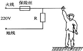 (2)一个潮湿的人,赤脚站在地上,由于不小心,手接触火线,发生触电事故,则通过人体的电流是多少(上表电阻数据适用此人)?并分析为什么熔断丝不会断(即熔断丝不能救人命).