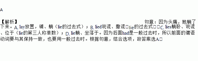 A 【解析】句意:因为头痛,她躺了下来。A. lay放置,铺、躺(lie的过去式);B. lied说谎、撒谎(lie的过去式);C. lies躺卧、说谎、位于(lie的第三人称单数);D. lie躺、坐落于。因为后面had是一般过去时,所以前面的谓语动词要与其保持一致,也要用一般过去时。根据句意,结合选项,故答案选A。书面表达