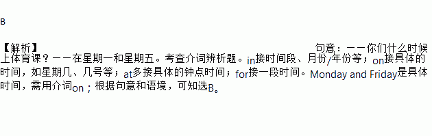B 【解析】句意:——你们什么时候上体育课?——在星期一和星期五。考查介词辨析题。in接时间段、月份/年份等;on接具体的时间,如星期几、几号等;at多接具体的钟点时间;for接一段时间。Monday and Friday是具体时间,需用介词on;根据句意和语境,可知选B。