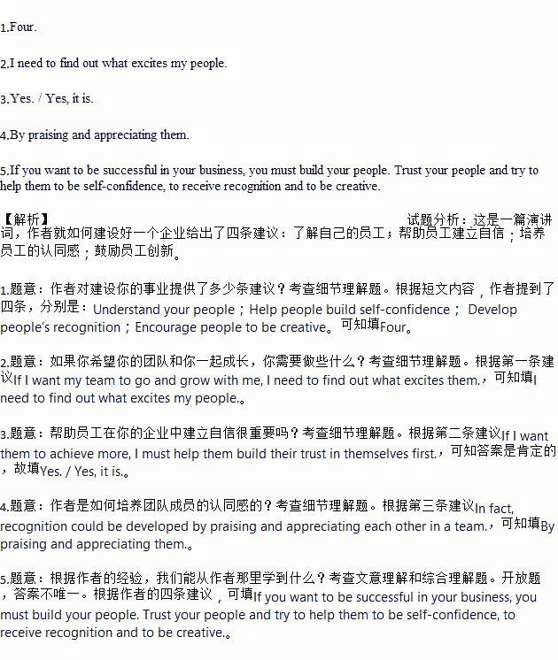 1.Four. 2.I need to find out what excites my people. 3.Yes. / Yes, it is. 4.By praising and appreciating them. 5.If you want to be successful in your business, you must build your people. ...