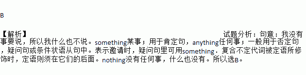 B ¡¾½âÎö¡¿ÊÔÌâ·ÖÎö£º¾äÒ⣺ÎÒûÓÐÊÂҪ˵£¬ËùÒÔÎÒʲôҲ²»Ëµ¡£somethingijÊ£»ÓÃÓڿ϶¨¾ä£¬anythingÈκÎÊ£»Ò»°ãÓÃÓÚ·ñ¶¨¾ä£¬ÒÉÎʾä»òÌõ¼þ×´Óï´Ó¾äÖС£±íʾÑûÇëʱ£¬ÒÉÎʾäÀï¿ÉÓÃsomething£®¸´ºÏ²»¶¨´ú´Ê±»¶¨ÓïËùÐÞÊÎʱ£¬¶¨ÓïÔòÐëÔÚËüÃǵĺóÃæ¡£nothingûÓÐÈκÎÊ£¬Ê²Ã´Ò²Ã»ÓС£ËùÒÔÑ¡B¡£