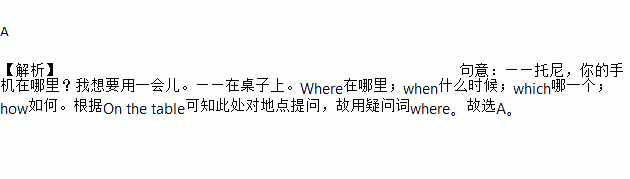 A ¡¾½âÎö¡¿¾äÒ⣺¡ª¡ªÍÐÄᣬÄãµÄÊÖ»úÔÚÄÄÀÎÒÏëÒªÓÃÒ»»á¶ù¡£¡ª¡ªÔÚ×À×ÓÉÏ¡£WhereÔÚÄÄÀwhenʲôʱºò£»whichÄÄÒ»¸ö£»howÈçºÎ¡£¸ù¾ÝOn the table¿ÉÖª´Ë´¦¶ÔµØµãÌáÎÊ£¬¹ÊÓÃÒÉÎÊ´Êwhere¡£¹ÊÑ¡A¡£