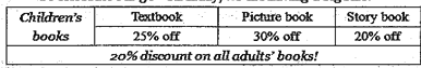 【2】题意:你可以在______________得到最大的折扣。考查细节理解。A. adults’ story books成人故事书;B. all magazines所有杂志;C. Children’s picture books儿童图画书;D. all text books所有教科书。根据第一个表格可知all text books折扣25%,Children’s picture books(儿童图画书)折扣30%,adults’ story books(成人故事书)折扣20%。故最大的折扣的书是Children’s picture books(儿童图画书);故选C。