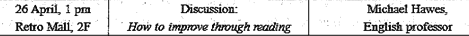 【3】题意:___________将通过阅读帮助你提高英语水平。考查细节理解。A. Claire Tay;B. Michael Hawes;C. David K.oh;D. Kate White。根据第2个表格第2栏可知4月26日下午1点在复古商城(Retro Mall)2楼,Michael Hawes英语教授举行关于怎样通过阅读提高英语的大讨论;可知选B。