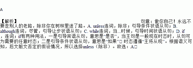 A 【解析】句意:做你自己!永远不要走别人的老路,除非你在树林里迷了路。A. unless连词,除非;引导条件状语从句;B. although连词,尽管,引导让步状语从句;C. while连词,当...时候,引导时间状语从句;D. if,连词;if有两种用法,一是引导宾语从句,意思是“是否”,当主句是一般现在时态时,从句可为需要的任意时态;二是引导条件状语从句,意思是“如果”, 时态遵循“主...
