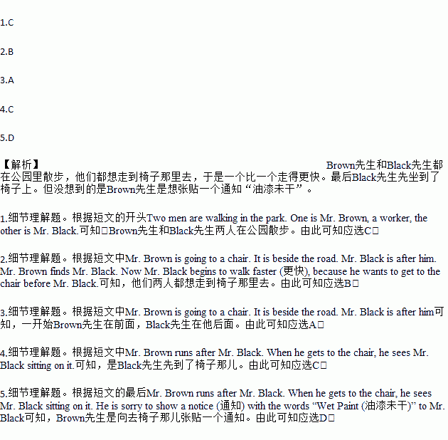 1.C 2.B 3.A 4.C 5.D 【解析】Brown先生和Black先生都在公园里散步,他们都想走到椅子那里去,于是一个比一个走得更快。最后Black先生先坐到了椅子上。但没想到的是Brown先生是想张贴一个通知“油漆未干”。 1.细节理解题。根据短文的开头Two men are walking in the park. One is Mr. Brown,...
