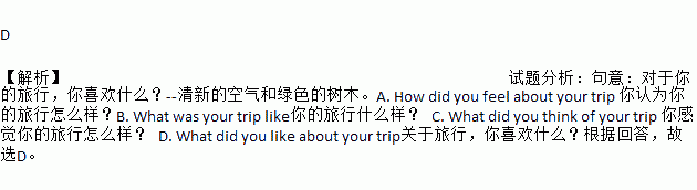 D 【解析】试题分析:句意:对于你的旅行,你喜欢什么?--清新的空气和绿色的树木。A. How did you feel about your trip 你认为你的旅行怎么样?B. What was your trip like你的旅行什么样? C. What did you think of your trip 你感觉你的旅行怎么样? D. What did you like about ...