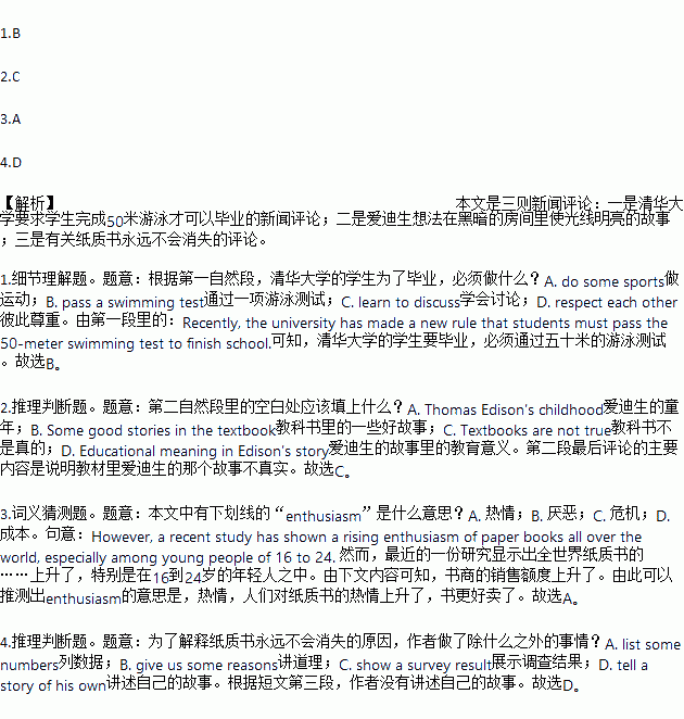 Learn to swim. Do you want to study in Tsinghua(清华) University? If your answer is yes, you need to be able to swim or get prepared to learn to swim from now on. Recently, the university has made a new rule that students must pass the 50-meter swimming test to finish school. This rule has been brought into a broad discussion. Some agree with it because it can help students do more sports, but others disagree. They believe that it doesn’t respect their personal wishes. It shouldn’t be a must for graduation. What’s your opinion?