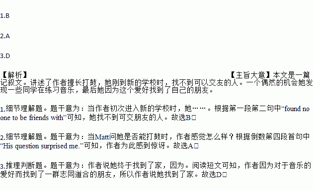 1.B 2.A 3.D ¡¾½âÎö¡¿¡¾Ö÷Ö¼´óÒâ¡¿±¾ÎÄÊÇһƪ¼ÇÐðÎÄ¡£½²ÊöÁË×÷ÕßÉó¤´ò¹Ä£¬Ëý¸Õµ½ÐµÄѧУʱ£¬ÕÒ²»µ½¿ÉÒÔ½»ÓѵÄÈË¡£Ò»¸öżȻµÄ»ú»áËý·¢ÏÖһЩͬѧÔÚÁ·Ï°ÒôÀÖ£¬×îºóËýÒòΪÕâ¸ö°®ºÃÕÒµ½ÁË×Ô¼ºµÄÅóÓÑ¡£ 1.ϸ½ÚÀí½âÌâ¡£Ìâ¸ÉÒâΪ£ºµ±×÷Õß³õ´Î½øÈëеÄѧУʱ£¬Ëý¡¡¡£¸ù¾ÝµÚÒ»¶ÎµÚ¶þ¾äÖС°found no one to be friends with¡±¿ÉÖª£¬ËýÕÒ²»µ½¿É½»ÅóÓѵÄÈË¡£¹ÊÑ¡B...