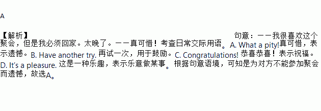 A 【解析】句意:——我很喜欢这个聚会,但是我必须回家。太晚了。——真可惜!考查日常交际用语。A. What a pity!真可惜,表示遗憾。B. Have another try. 再试一次,用于鼓励。C. Congratulations! 恭喜恭喜!表示祝福。D. It’s a pleasure. 这是一种乐趣,表示乐意做某事。根据句意语境,可知是为对方不能参加聚会而遗憾,故选A。 ...