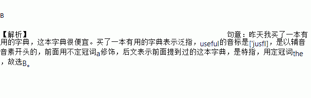 B 【解析】句意:昨天我买了一本有用的字典,这本字典很便宜。买了一本有用的字典表示泛指,useful的音标是['jusfl],是以辅音音素开头的,前面用不定冠词a修饰,后文表示前面提到过的这本字典,是特指,用定冠词the,故选B。