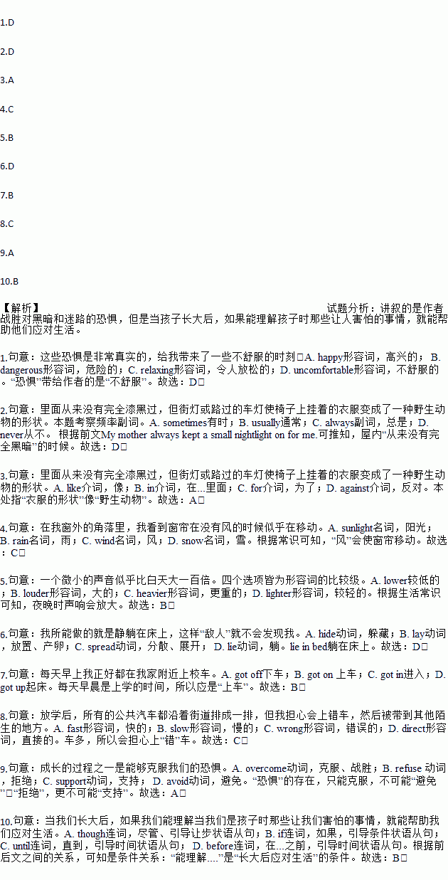 1.D 2.D 3.A 4.C 5.B 6.D 7.B 8.C 9.A 10.B 【解析】试题分析:讲叙的是作者战胜对黑暗和迷路的恐惧,但是当孩子长大后,如果能理解孩子时那些让人害怕的事情,就能帮助他们应对生活。 1.句意:这些恐惧是非常真实的,给我带来了一些不舒服的时刻。A. happy形容词,高兴的; B. dangerous形...