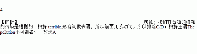 A 【解析】句意:我们有石油的海滩的污染是糟糕的。根据 terrible.形容词做表语,所以前面用系动词,所以排除C/D;根据主语The pollution不可数名词;故选A
