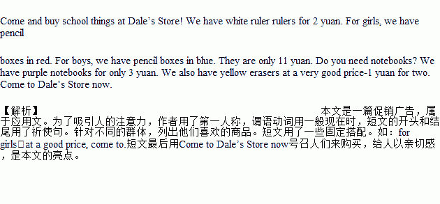 假如你经营一家名为Dale's Store的文具店,请根据下表内容提示用英语写一则促销广告。70词左右,可适当发挥。