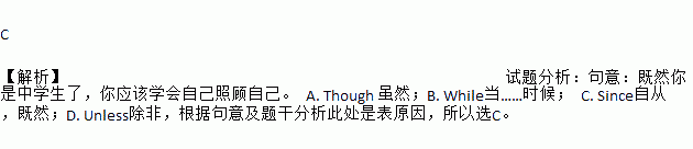 C 【解析】试题分析:句意:既然你是中学生了,你应该学会自己照顾自己。 A. Though 虽然;B. While当……时候; C. Since自从,既然;D. Unless除非,根据句意及题干分析此处是表原因,所以选C。