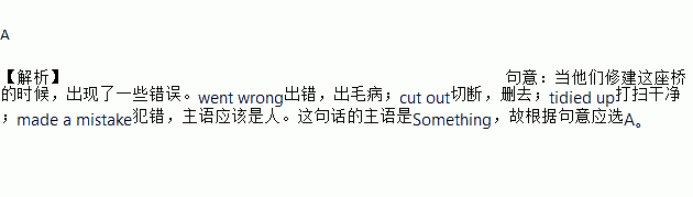 A ¡¾½âÎö¡¿¾äÒ⣺µ±ËûÃÇÐÞ½¨Õâ×ùÇŵÄʱºò£¬³öÏÖÁËһЩ´íÎó¡£went wrong³ö´í£¬³ö벡£»cut outÇжϣ¬É¾È¥£»tidied up´òɨ¸É¾»£»made a mistake·¸´í£¬Ö÷ÓïÓ¦¸ÃÊÇÈË¡£Õâ¾ä»°µÄÖ÷ÓïÊÇSomething£¬¹Ê¸ù¾Ý¾äÒâӦѡA¡£