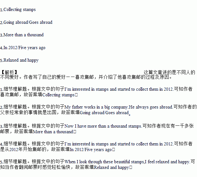 My father works in a big company.He always goes abroad.Five years ago,when he was working in America,he sent home a letter with a beautiful stamp on the envelope(信封).I liked the stamp very much.From then on,I have always asked my father to send me different stamps from different countries.Later I joined a club and I have made many friends there.They helped me learn more about stamps and I always traded (交换) stamps from them.