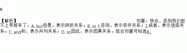 B 【解析】句意:快点,否则我们赶不上早班车了。A. but但是,表示转折关系;B. or 1.否则,表示条件关系;2.或者,表示选择关系;C. and和,表示并列关系;D. so因此,表示因果关系。结合句意可知选B。